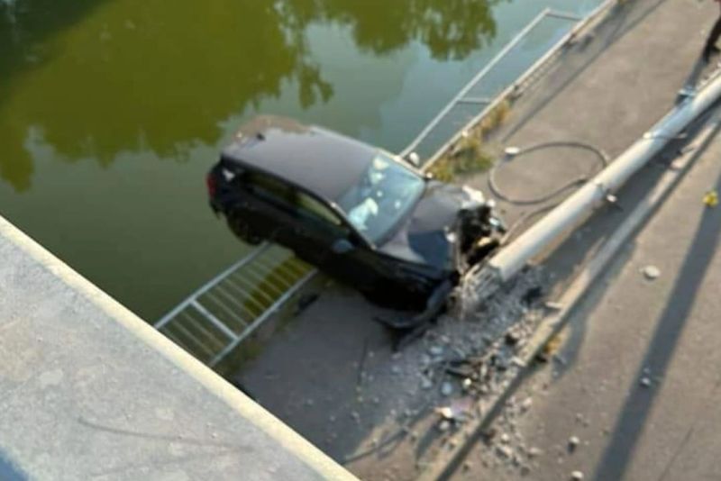 În urma impactului, vehiculul a rupt gardul de protecție instalat pe marginea drumului și a rămas suspendat deasupra lacului Străulești.