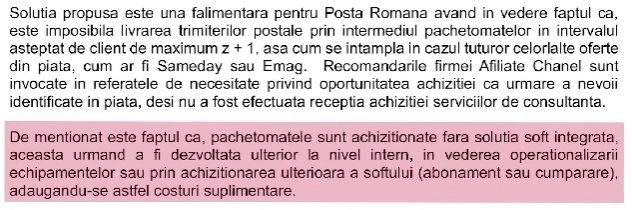 „Una dintre propunerile din bugetul de investitii care nu are nici un fundament este cea a achizitionarii unui numar de 3000 de pachetomate care vor fi amplasate in interiorul sau langa oficiile postale pentru a degreva angajatii de la ghiseu. Pentru acestea desi sunt prevazuti in buget 75 milioane lei plus TVA, achizitiile vor fi in valoare de 100 milione lei fara TVA, diferenta fiind redistribuita de la alte obiective. Acest lucru se intampla in conditiile in care oficiile in care se vor amplasa aceste dispozitive au raportat pierderi rezultand astfel ca, nu exista un surplus de trimiteri postale care sa nu poata fi prelucrate in timp util, ci, din contra, datorita scaderii de la luna la luna a volumului de corespondenta, o astfel de investitie a fost facuta fara sa aduca nici un fel de plus valoare, si fara o analiza de eficienta”.