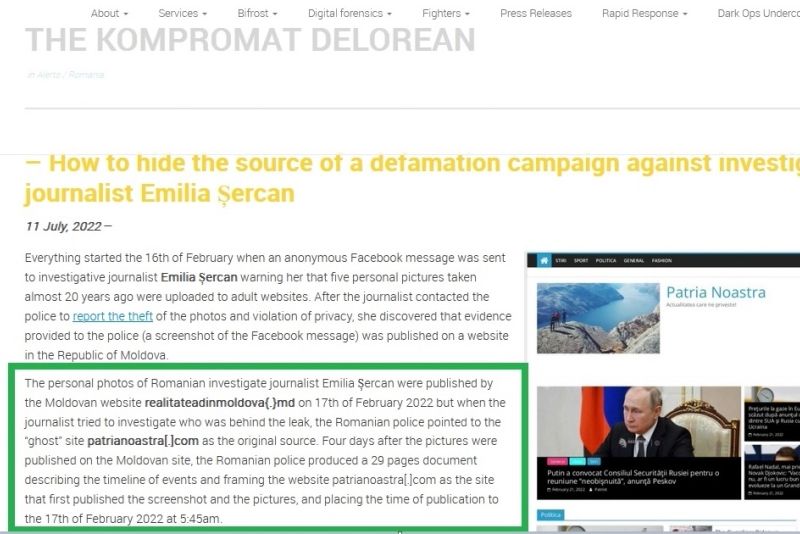“Fotografiile personale ale jurnalistei române de investigație Emilia Șercan au fost publicate de site-ul moldovenesc realitateadinmoldova{.}md pe 17 februarie 2022, dar când jurnalista a încercat să investigheze cine se afla în spatele scurgerii, Poliția Română a indicat site-ul „fantomă” patrianoastra[.]com ca sursă originală. La patru zile după ce pozele au fost publicate pe site-ul din Moldova, Poliția Română a prezentat un document de 29 de pagini în care era descrisă cronologia evenimentelor și a indicat site-ul patrianoastra[.]com drept site-ul care a publicat pentru prima dată captura de ecran și imaginile și a stabilit ca dată de publicare ziua de 17 februarie 2022, ora 5:45.”