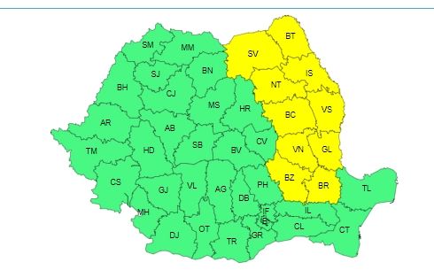 Meteorolgii anunţă, miercuri, cod galben de vânt puternic în judeţe din Moldova şi nord-estul Munteniei. Potrivit ANM, miercuri, până la ora 20.00, vântul va prezenta intensificări temporare în Moldova şi nord-estul Munteniei, cu viteze la rafală de 55…65 km/h. ”Intensificări ale vântului cu viteze în general de 45…55 km/h vor fi şi în restul Munteniei, Dobrogea şi local în Oltenia”, a mai transmis ANM.
