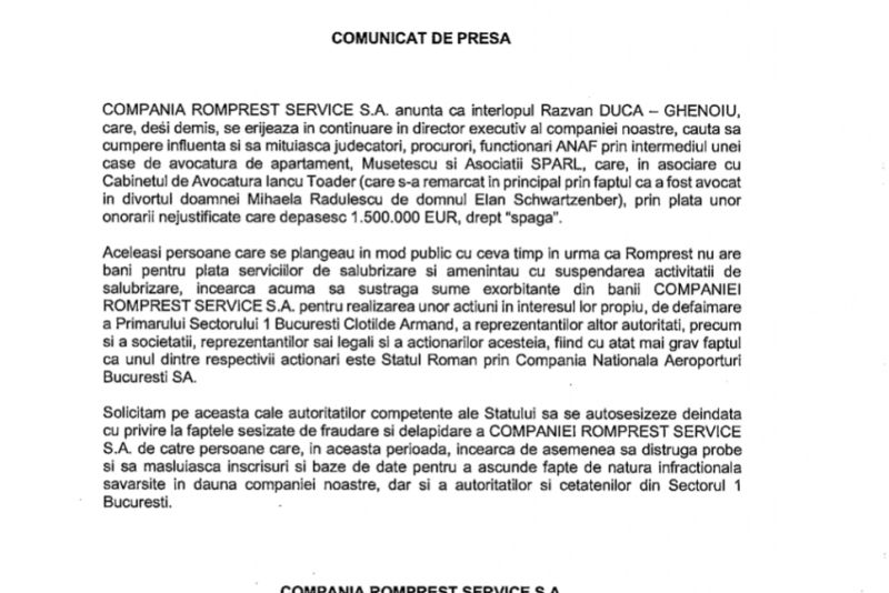 Într-un comunicat de presă dat publicității pe SITE-UL romprest.ro, COMPANIA ROMPREST SERVICE S.A. anunță că "interlopul Răzvan Duca-Ghenoiu, care, deși demis, se erijează în continuare în director executiv al companiei noastre, caute să cumpere influență și să mituiască judectători, procurori și funcționari ANAF prin intermediul unei case de avocatură de apartament, Mușetescu și Asociații SPARL, care, în asociere cu Cabinetul de Avocatură Iancu Toader (care s-a remarcat în principal prin faptul că a fost avocat în divorțul doamnei Mihaela Rădulescu de domnul Elan Schwartzenberg), prin plata unor onorarii nejustificate care depășesc 1.500.000 EUR, drept <șpagă>".
