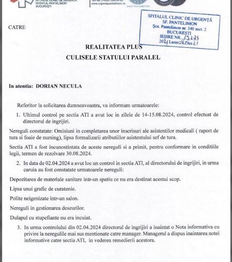 Reprezentanții Spitalului Pantelimon, în urma unei solicitări adresate de Realitatea Plus în cadrul emisiunii "Culisele Statului Paralel", au oferit detalii cu privire la controalele recente efectuate în secția ATI a unității medicale. În răspunsul oficial, aceștia au menționat că ultimul control efectuat în secția ATI a avut loc în zilele de 14 și 15 august 2024, fiind realizat de directorul de îngrijiri.