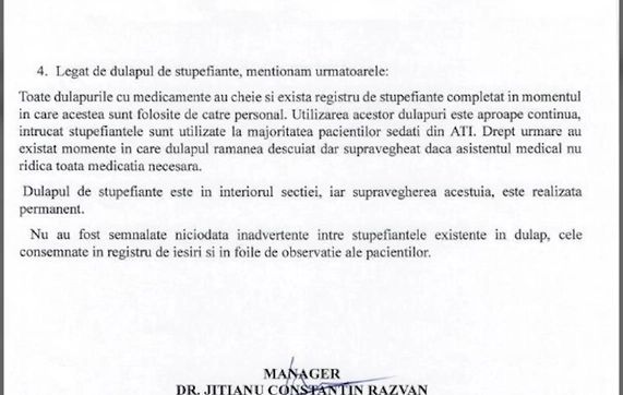 Toate dulapurile cu medicamente au cheie si exista registru de stupefiante completat in momentul in care acestea sunt folosite de catre personal. Utilizarea acestor dulapuri este aproape continua, intrucat stupefiantele sunt utilizate la majoritatea pacientilor sedati din ATI. Drept urmare au existat momente in care dulapul ramanea descuiat dar supravegheat daca asistentul medical nu ridica toata medicatia necesara. Dulapul de stupefiante este in interiorul sectiei, iar supravegherea acestuia, este realizata permanent. Nu au fost semnalate niciodata inadvertente intre stupefiantele existente in dulap, cele consemnate in registru de iesiri si in foile de observatie ale pacientilor”, au răspuns reprezentanții spitalului pentru Culisele Statului Paralel.