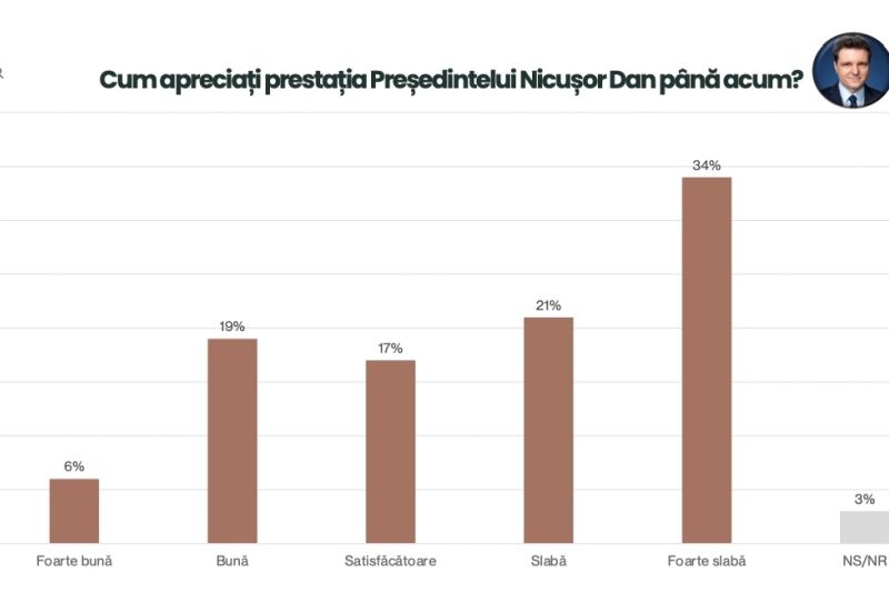 Mai mult, întrebați cum apreciază prestația președintelui Nicușor Dan din prima lună de mandat, românii au răspuns, tranșant: FOARTE SLABĂ. Doar 6% dintre cetățeni consideră că președintele a făcut treabă bună.
