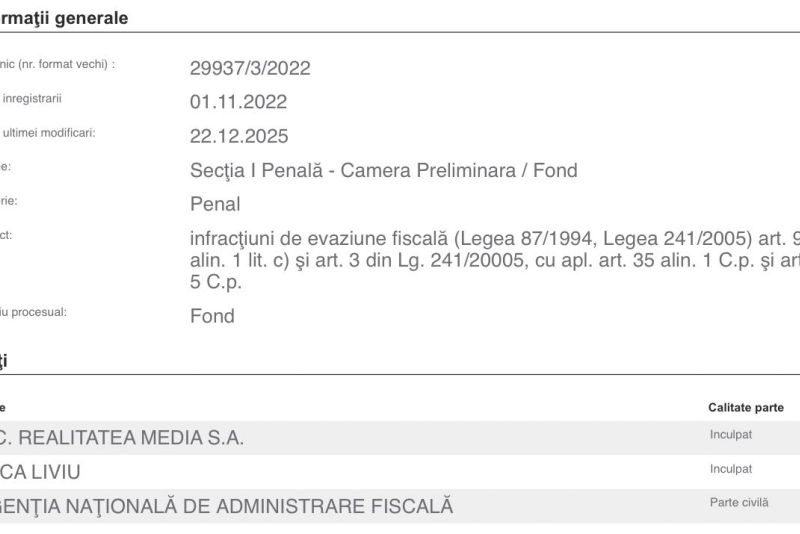 Dosarul 29937/3/2022: SC Realitatea Media – în calitate de inculpat; Luca Liviu – care, în acel timp, era administrator judiciar, inculpat; iar ANAF este parte civilă în acest dosar.