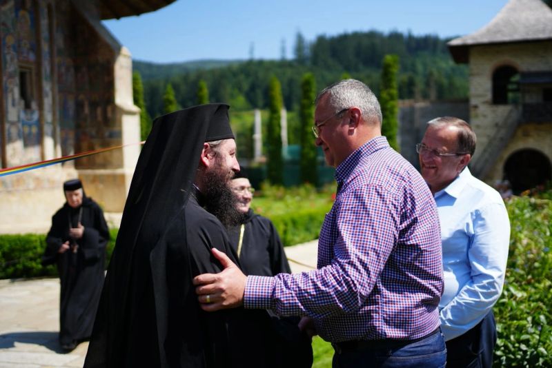 În continuare, în biserica mare a mănăstirii cu hramul „Sfântul Mare Mucenic Gheorghe, purtătorul de biruință” a avut loc un moment deosebit în cadrul căruia domnul Nicolae Ionel Ciucă a primit din partea Înaltpreasfințitului Părinte Calinic, Arhiepiscop al Sucevei și Rădăuților, cea mai înaltă distincție a eparhiei, Ordinul „Crucea Bucovinei”, înmânată de către Preasfințitul Părinte Damaschin Dorneanul. „Ne exprimăm bucuria și onoarea de a ne fi astăzi oaspeți. Vă transmitem bun venit din partea Înaltpreasfințitului Părinte Arhiepiscop Calinic al Sucevei și Rădăuților, ne rugăm lui Dumnezeu ca șederea dumneavoastră aici să fie una care să vă ajute la cele dinlăuntru, astfel încât revenind la îndatoririle dumneavoastră să aveți mai multă putere și mai multă lumină de unde decât de sus, de la Domnul, care să ne îndrepte spre cele bune. Vă mulțumim pentru tot ce ați făcut, și în calitate de premier, și în calitatea pe care o veți acum, pentru toți românii. În chip deosebit vă mulțumim pentru ajutorul, susținerea pe care ați arătat-o dintotdeauna Bisericii Ortodoxe Române, și în chip special Arhiepiscopiei Sucevei și Rădăuților. În semn de prețuire și de recunoștință avem plăcerea și onoarea de a vă oferi din partea Înaltpreasfințitului Părinte Arhiepiscop Calinic cea mai înaltă distincție a eparhiei noastre, Crucea Bucovinei.”