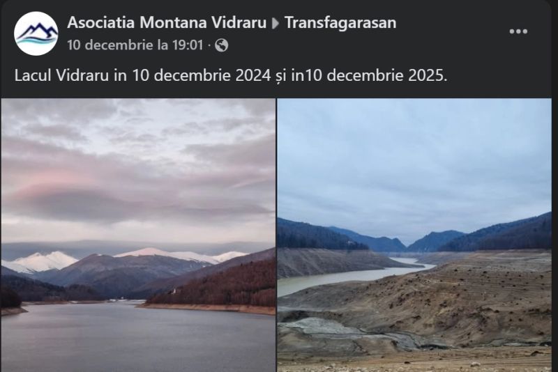 La jumătatea lunii decembrie 2025, nivelul lacului Vidraru a scăzut cu 100 de metri față de nivelul maxim, conform plăcuței martor. Coada lacului Vidraru se află acum la 5 km de baraj, a scris grupul FB Transfăgărășan.