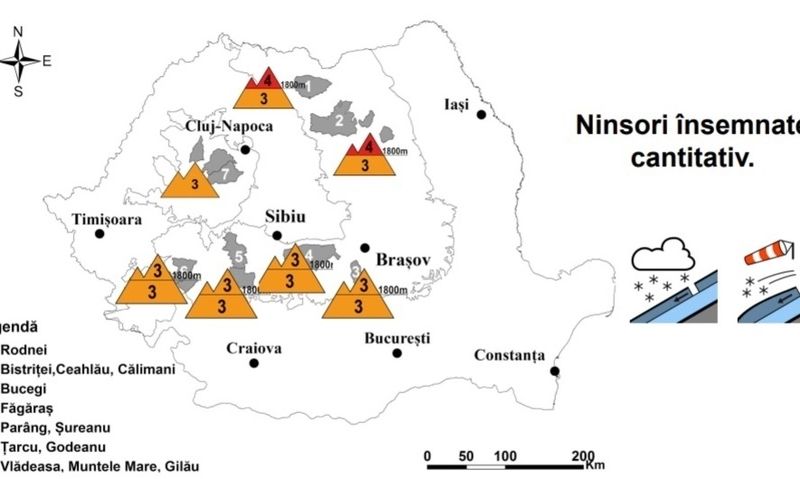 „La peste 1800 m, în ultimele 36 de ore s-au semnalat ninsori ce au depăşit pe alocuri 30 l/mp şi care au depus local un strat însemnat de zăpadă, iar în perioada următoare se va depune un nou strat consistent de zăpadă proaspătă. Acest ultim strat s-a depus peste un strat mai vechi, de 30-40 cm, cu rezistenţă relativ redusă şi coeziune slabă între cristale. Pe văi şi în zonele adăpostite sunt troiene şi depozite însemnate. În zona crestelor sunt formate cornişe şi numeroase plăci de vânt. Stratul vechi de zăpadă, din profunzime, este compactat şi întărit. Pe pantele suficient de înclinate şi pe văile unde sunt depozite mari de zăpadă, se pot declanşa spontan avalanşe de dimensiuni medii şi mari, prin alunecarea stratului puţin rezistent de la suprafaţă sau prin ruperea plăcilor de vânt, riscul fiind amplificat chiar şi la supraîncărcări mici ale stratului. Avalanşele pot angrena izolat şi straturile subiacente, mai vechi”, potrivit ANM.