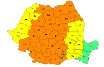 Zonele vizate: În Oltenia, cea mai mare parte a Transilvaniei și Munteniei, jumătatea de nord a Moldovei și local în Banat și în Maramureș, vor fi perioade cu averse torențiale, intensificări de scurtă durată ale vântului și vijelii, cu viteze la rafală în general de 70...90 km/h, descărcări electrice și grindină. În intervale scurte de timp (1...3 ore) sau prin acumulare cantitățile de apă vor fi de 25...40 l/mp și pe arii restrânse de peste 50...70 l/mp.