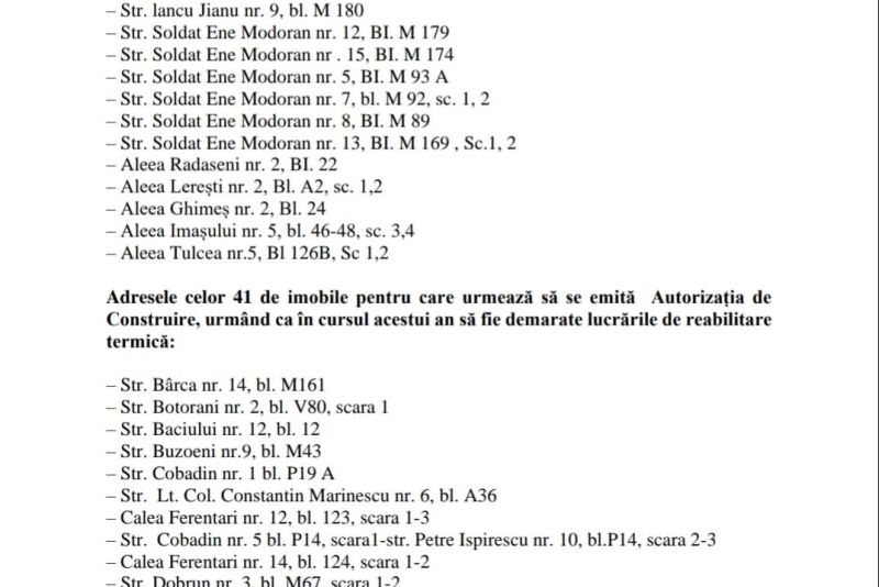 Lista cu blocurile care vor fi reabilitate în acest an o regăsiți mai jos.