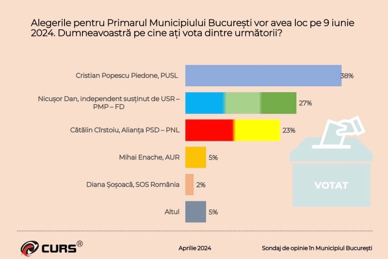 La întrebarea cu cine ar vota pentru Primăria Capitalei, cei chestionați în luna aprilie au răspuns cu Cristian Popescu Piedone, 38%, Nicușor Dan 27% și Cătălin Cîrstoiu, 23%.