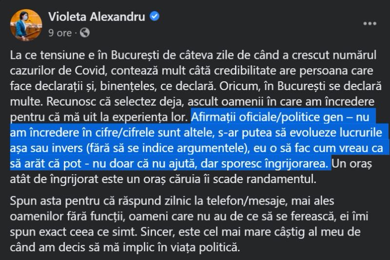 Pana sa vorbim despre cum comunicam, ceea ce comunicam ar trebui sa fie cat mai aproape de adevar. Conteaza, mai ales in situatii de genul asta. Altfel de furam singuri caciula mintindu-ne frumos.Banuiesc ca nu stiai despre “inovatiile” de mai sus. Asta poate iti lamureste de ce am spus zilele trecute ca “cifrele sunt altele”, a precizat ministru Sănătății.În postarea care a provocat reacția virulentă, Violeta Alexandru scrisese că: "Afirmații oficiale/politice gen – nu am încredere în cifre/cifrele sunt altele, s-ar putea să evolueze lucrurile așa sau invers (fără să se indice argumentele), eu o să fac cum vreau ca să arăt că pot - nu doar că nu ajută, dar sporesc îngrijorarea. Un oraș atât de îngrijorat este un oraș căruia îi scade randamentul."