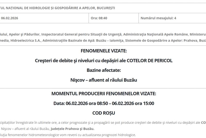 Potrivit autorităților, în intervalul 6 februarie 2026, între orele 08:50 și 15:00, sunt posibile creșteri importante de debite și niveluri, cu depășirea cotelor de pericol pe râul Nișcov, afluent al râului Buzău, pe sectoare din județele Prahova și Buzău.